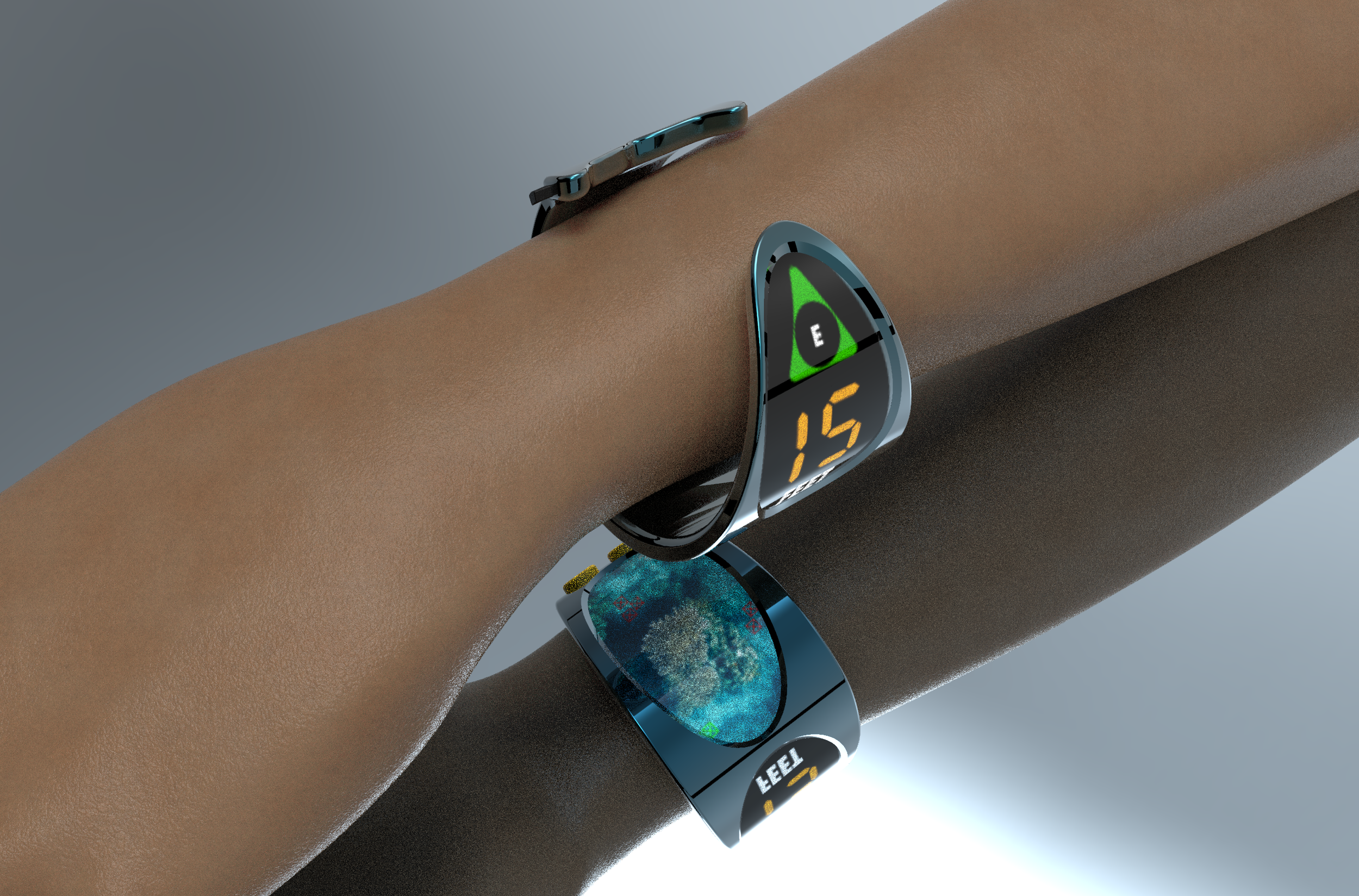 I created 60 exploratory sketches of diver wristbands after measuring wrists for anthropometrics, focusing on how the wrist is one of the fastest and most visible points to access in a moment of panic. Each form tests proportion, texture, and fastening systems to ensure the band can be located and understood instantly underwater.